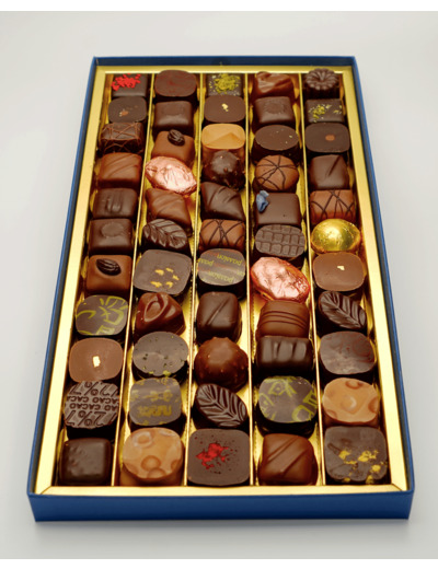 Un assortiment de 55 chocolats soigneusement sélectionnés pour vous par l'équipe parmi notre collection de chocolats noirs, lait, pralinés et ganaches.