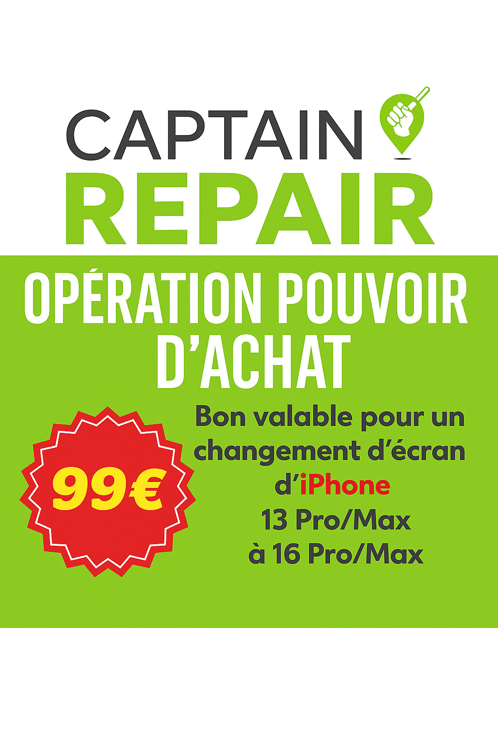Ce bon de réduction vous permet de faire remplacer l'écran de votre iPhone (modèles 8 à 16) pour seulement 99€ jusqu'au 25 décembre.