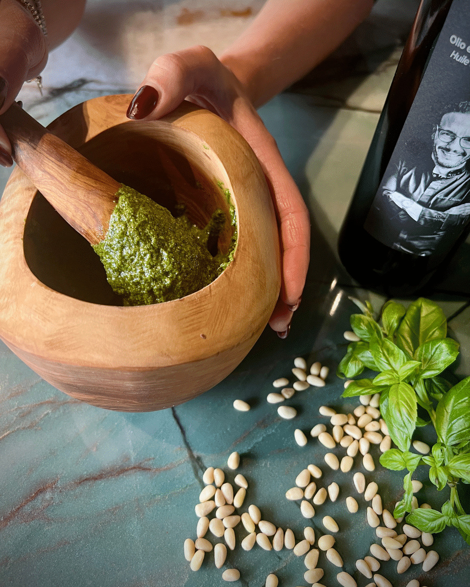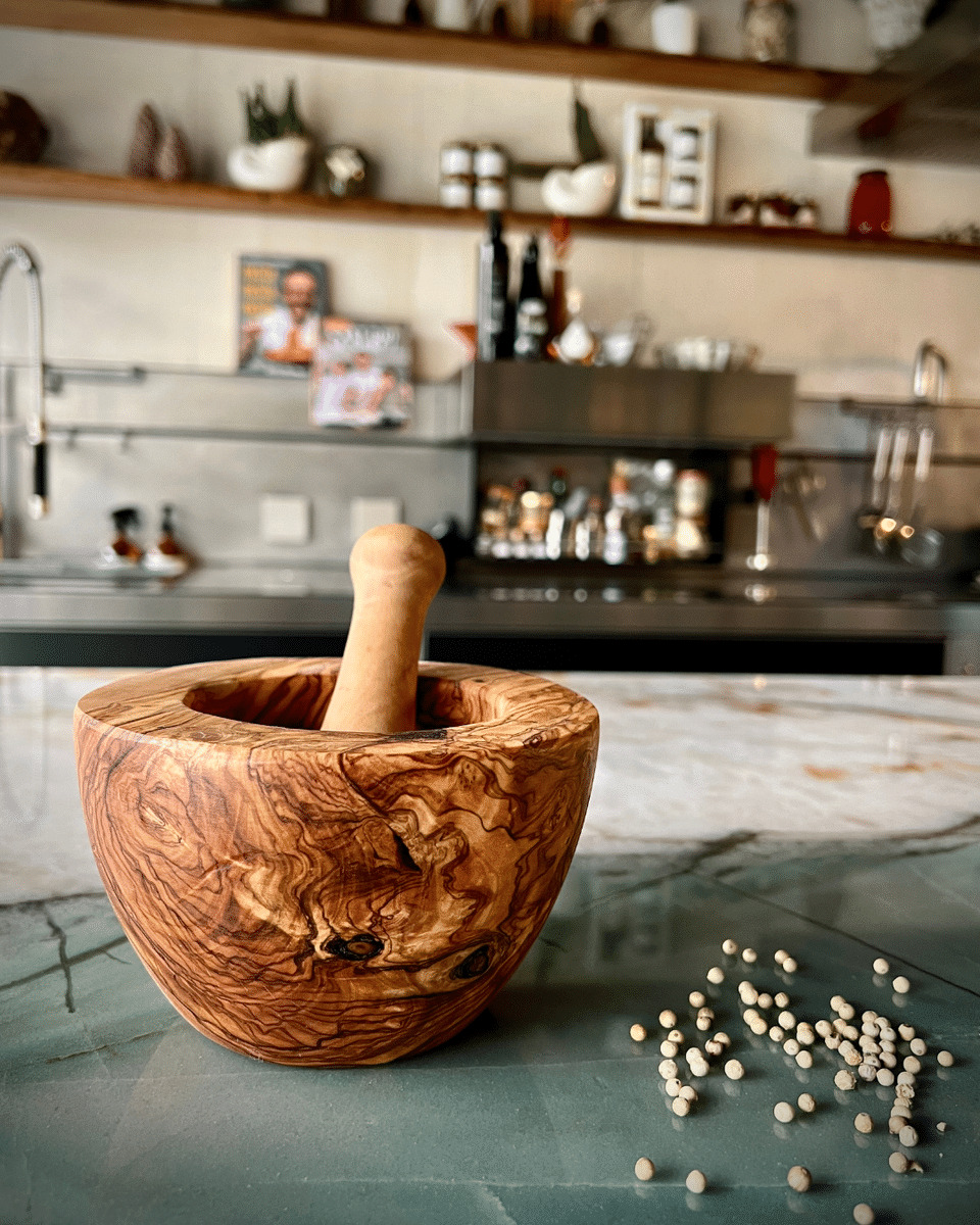 Le Mortier et le Pilon Bomba Atomica en bois d’olivier sont des outils traditionnels utilisés dans la cuisine pour la préparation de sauces, de pesto, d’épices et d’assaisonnements de manière efficace, offrant plus de contrôle sur la consistance du produit final.