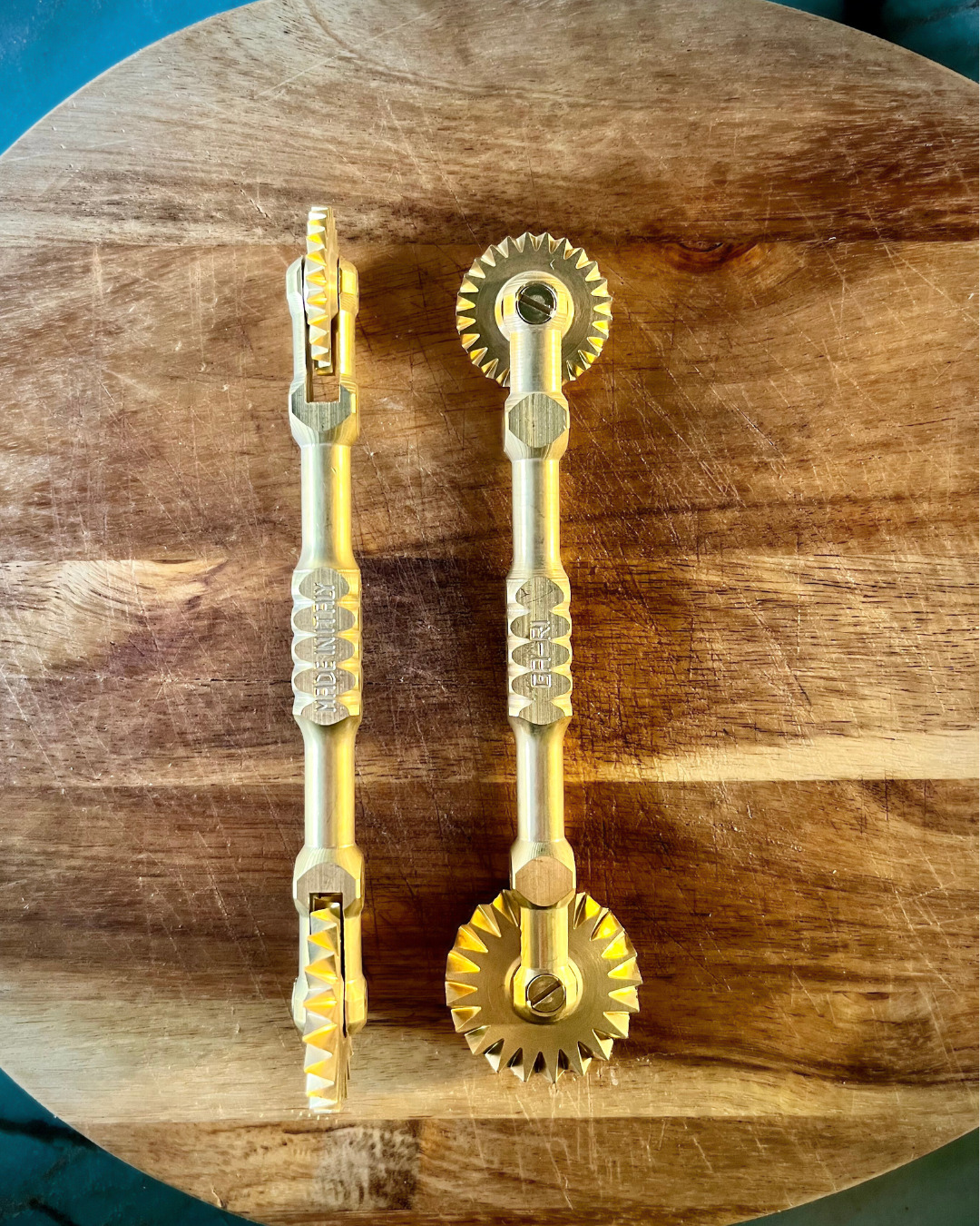 - Roulette coupe-pâtes double : Deux lames dentelées (5 mm et 3 mm), entièrement en laiton.
