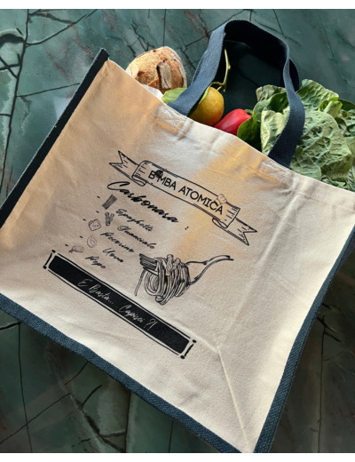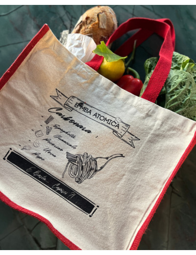 Le Shopping Bag Carbonara, l’accessoire indispensable pour les vrais amateurs ! Idéal comme sac pour faire les courses, il vous accompagne partout. Avec son motif affichant la vraie recette de la carbonara, c’est un must-have en édition limitée.