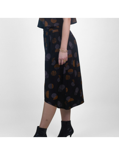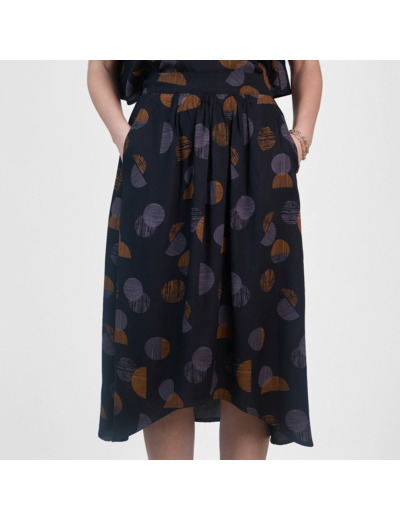 Une jupe longue, évasée et asymétrique qui transforme nos démarches en pas décidés. Sa confection est d’une rapidité remarquée et la porter offre une satisfaction sans pareille.