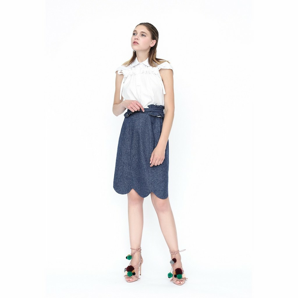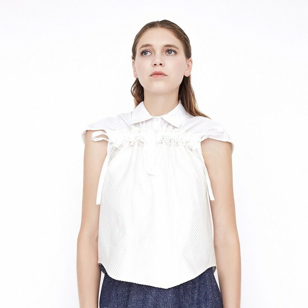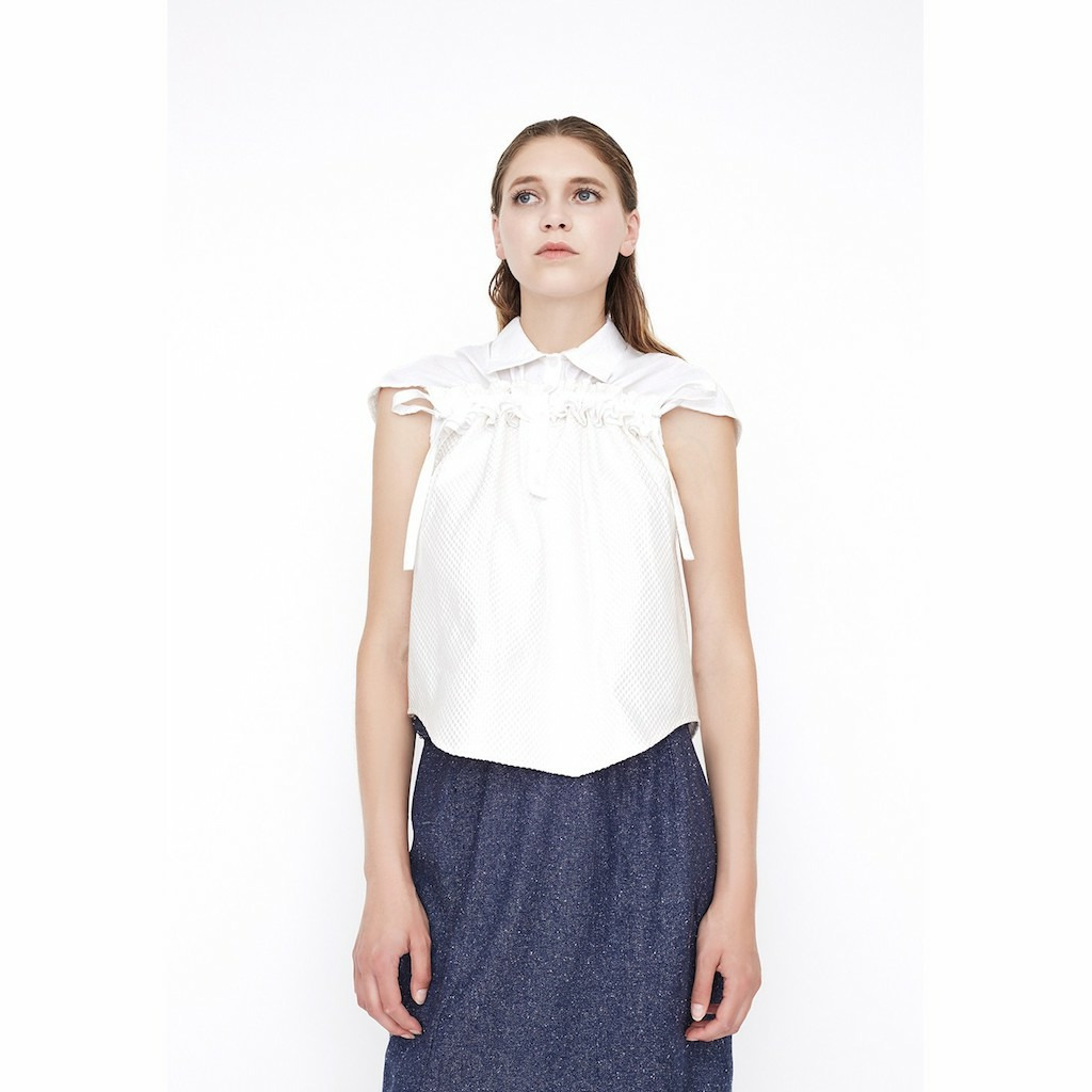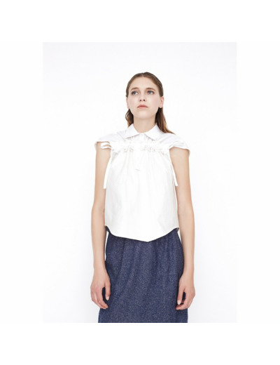 Pour ce top, nous avons voulu jouer les volumes avec des liens permettant de coulisser à discrétion les deux parties haute, augmentant alors le volume créé par un volant.