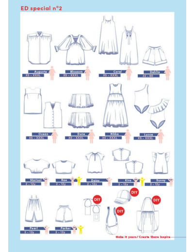 Avec pas moins de 19 patrons estivaux au lieu des 12 habituels ainsi que des projets DIY, tout le monde trouvera son bonheur. Dans cette édition nous te proposons des patrons innovants, comme un maillot de bain unique et une casquette tendance ! Une journée à la plage, un voyage, des barbecues chaleureux, des fêtes... tu trouveras dans cette édition la bonne tenue pour chaque occasion 😉Adapte les patrons à ta guise et combine-les pour réaliser des créations spectaculaires. Finis ta tenue d'été avec le sac Mehri intemporel et tellement pratique, ou un autre projet DIY.