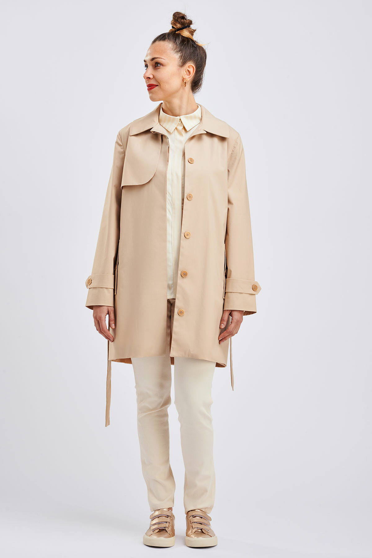 "I am Bob" est un trench avec une coupe droite et ajustée. Il a un bavolet fini avec une demie-boucle en métal au dos. Il a une patte de boutonnage cachée. On peut le choisir avec deux cols : un col droit montant, ou un col chemisier. Il a des manches montées avec, au bas, une patte de resserrage et deux boutons. Il est agrémenté d'une poche passepoilée avec un faux rabat boutonné. On peut le cintrer grâce à une ceinture amovible qui se finit en pointe à laquelle on a l’option d’ajouter une boucle et des œillets. Il suis entièrement doublé et il a une fente dans le dos. Il se décline en 4 longueurs : court (sous-fesse), mi-cuisse, genou et midi.