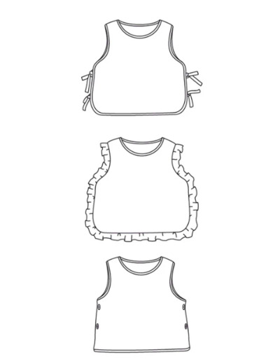 Brisbane kids est un patron de plastron ou pull sans manches pour enfant, avec une ouverture sur les côtés et des finitions très soignées. La forme est ample. Le modèle est entièrement doublé et en option, gansé. En option, on peut ajouter ou non des volants. Le plastron se ferme avec des liens ou des boutons.