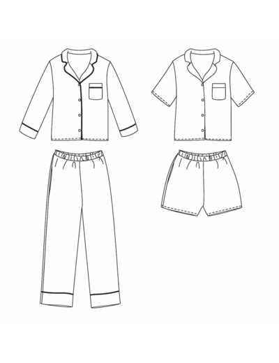 Budapest kids est un patron de pyjama pour enfant, composé d’un haut à col tailleur, et d’un bas droit à taille élastiquée avec des poches côté. Le haut se décline en version manches longues avec revers aux poignets ou en version manches courtes. Le bas propose une option pantalon avec les revers aux chevilles et une option short. L’ensemble peut être entièrement agrémenté d'une finition passepoil.