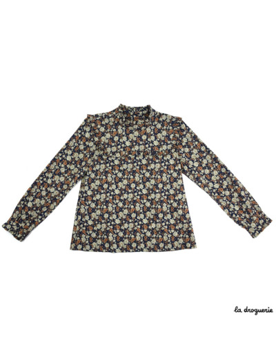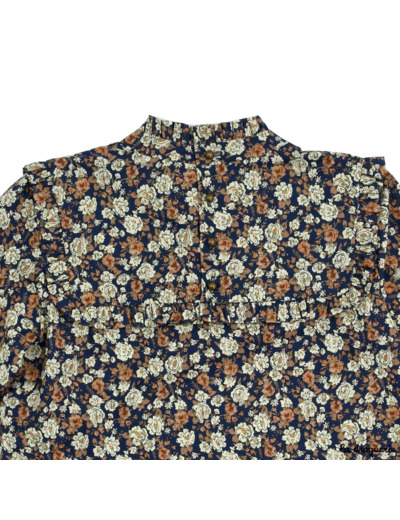 Jolie blouse à col montant fermée dans le haut du dos par des boutons. Petits volants froncés sur le bas des poignets, le haut du col et le tour de l’empiècement du devant et du dos.