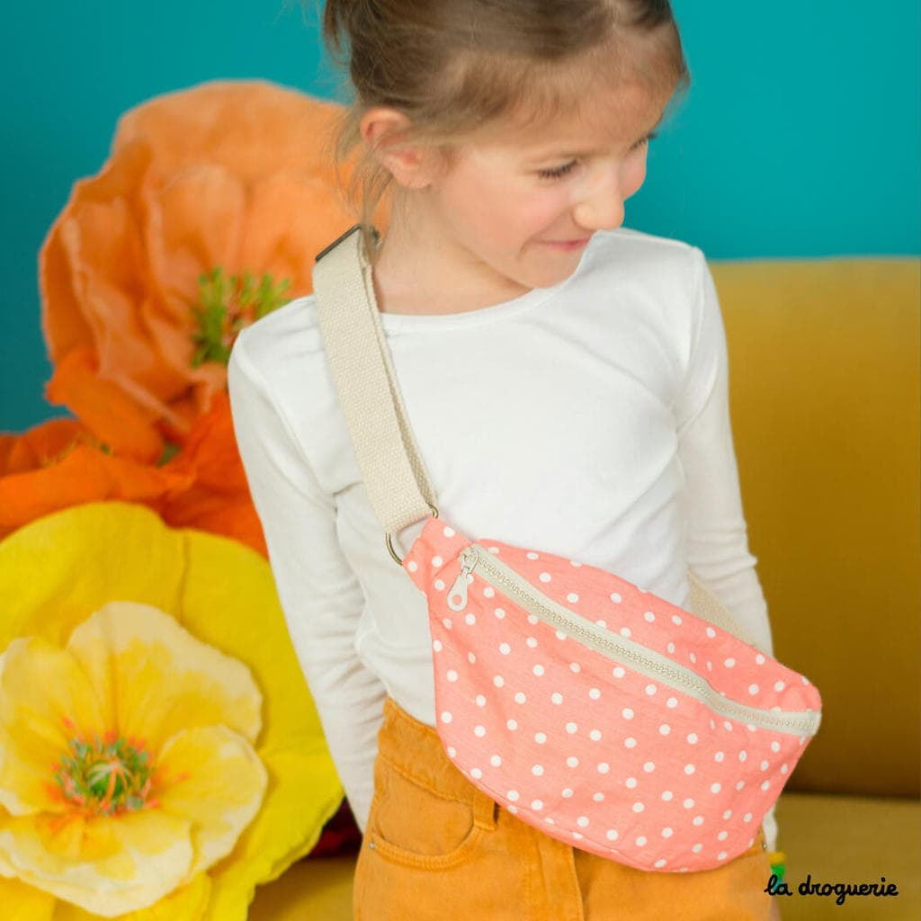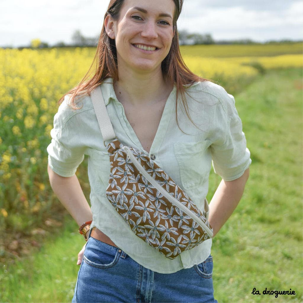 Sac banane doublé avec sangle réglable. Sur le patron, trois versions sont proposées: une taille enfant, une taille M (médium) et une taille XL. Les versions enfant et femme en taille M sont thermocollées pour un meilleur maintient des tissus. Si votre tissu est bien épais ou rigide, pas besoin de thermocoller.