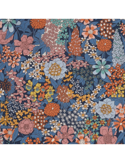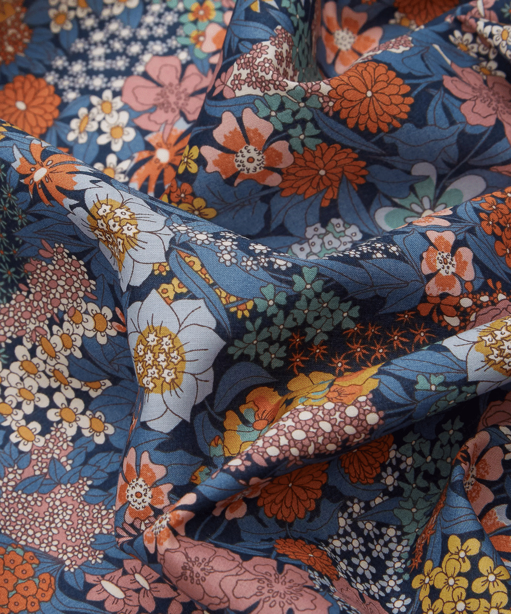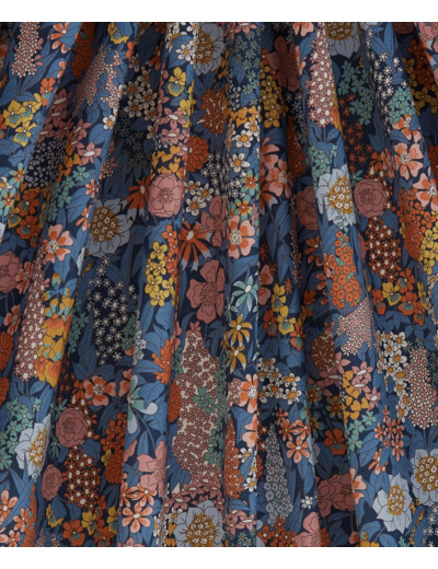 Le Liberty Tana Lawn est une fine batiste en pur coton. Lisse, doux, et légèrement soyeux, c’est un des tissus en coton les plus agréables à porter. Motif fleuri Ciara en bleu denim rouille, aux couleurs très automnales.