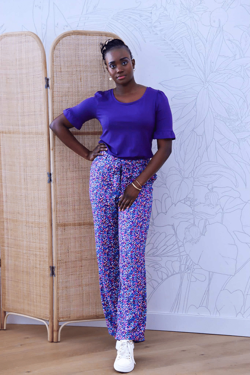Giverny est un pantalon taille haute fluide et élégant à porter pendant les beaux jours. Sa coupe est légèrement ajustée au niveau des cuisses et évasée sur le bas. La taille est mise en valeur avec une ceinture à nouer qui se glisse dans des passants. Seul le dos est élastiqué et les plis sur le devant donnent l’aisance nécessaire pour un pantalon confortable.