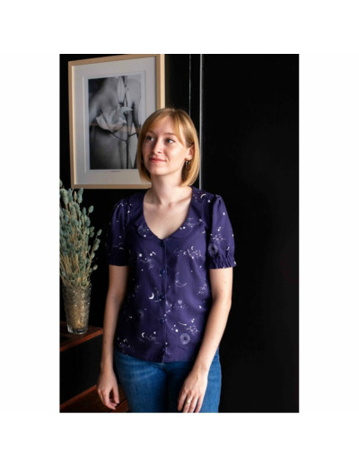 Une robe délicate et raffinée. Boutonnée devant, élastiquée à la taille et dotée d’un col festonné, le patron propose 2 versions de manches ainsi qu’une version blouse.