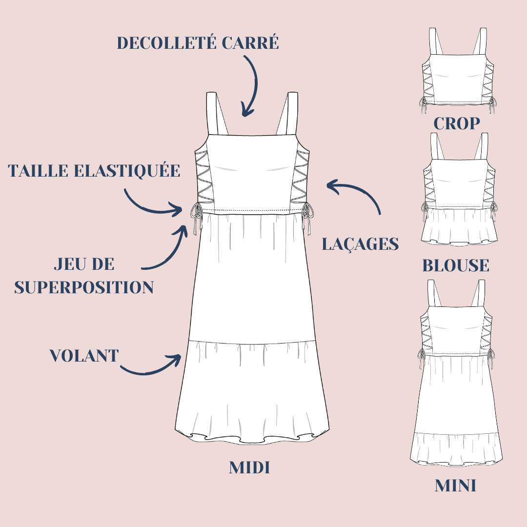 En crop top, en blouse, en robe courte ou midi, les possibilités sont nombreuses de la robe Romance. Jouez l’illusion avec cette pièce qui se porte comme un ensemble top & jupe d’un seul tenant. Le buste au tombé droit se positionne sur une robe élastiquée à la taille pour accentuer l’effet de superposition. Les larges bretelles et le décolleté carré sont adoucis par un délicat laçage sur les côtés que vous pouvez réaliser ou non. La jupe froncée avec une découpe lui apporte une touche bohème et romantique.