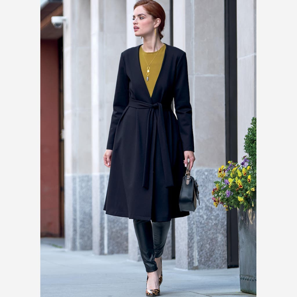 Veste non doublée à poches dans la couture latérale, ceinture nouée, ourlets piqués, et variations de longueur, dencolure et de tissu.