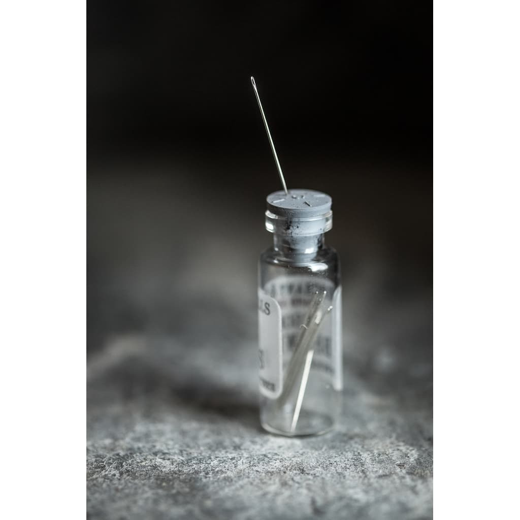 Un mélange de 10 tailles légèrement différentes regroupées dans un flacon en verre Merchant & Mills avec un bouchon en caoutchouc.