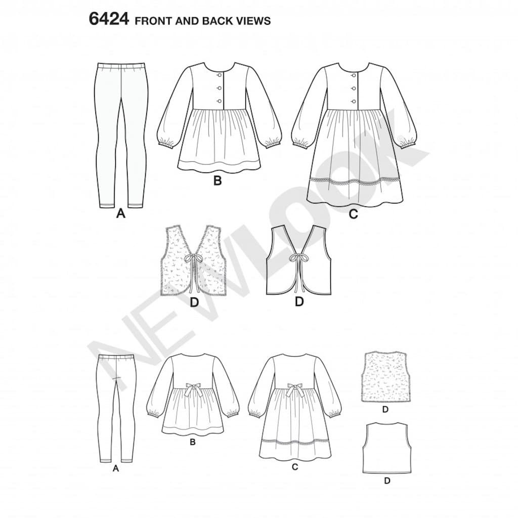 Patron de tunique, robe, legging et gilet pour filles de 3-8 ans.