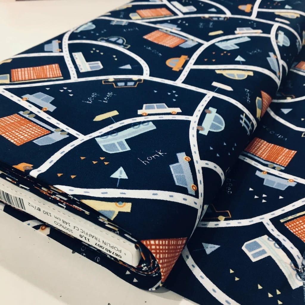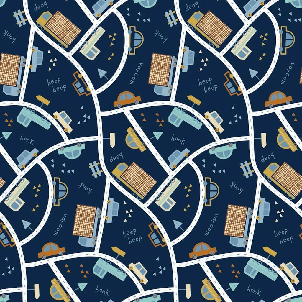 Cette ravissante popeline de coton bleu marine imprimé de la route avec de petites voitures sera parfaite pour vos créations pour les enfants: deco, tapis de jeux, pyjamas...