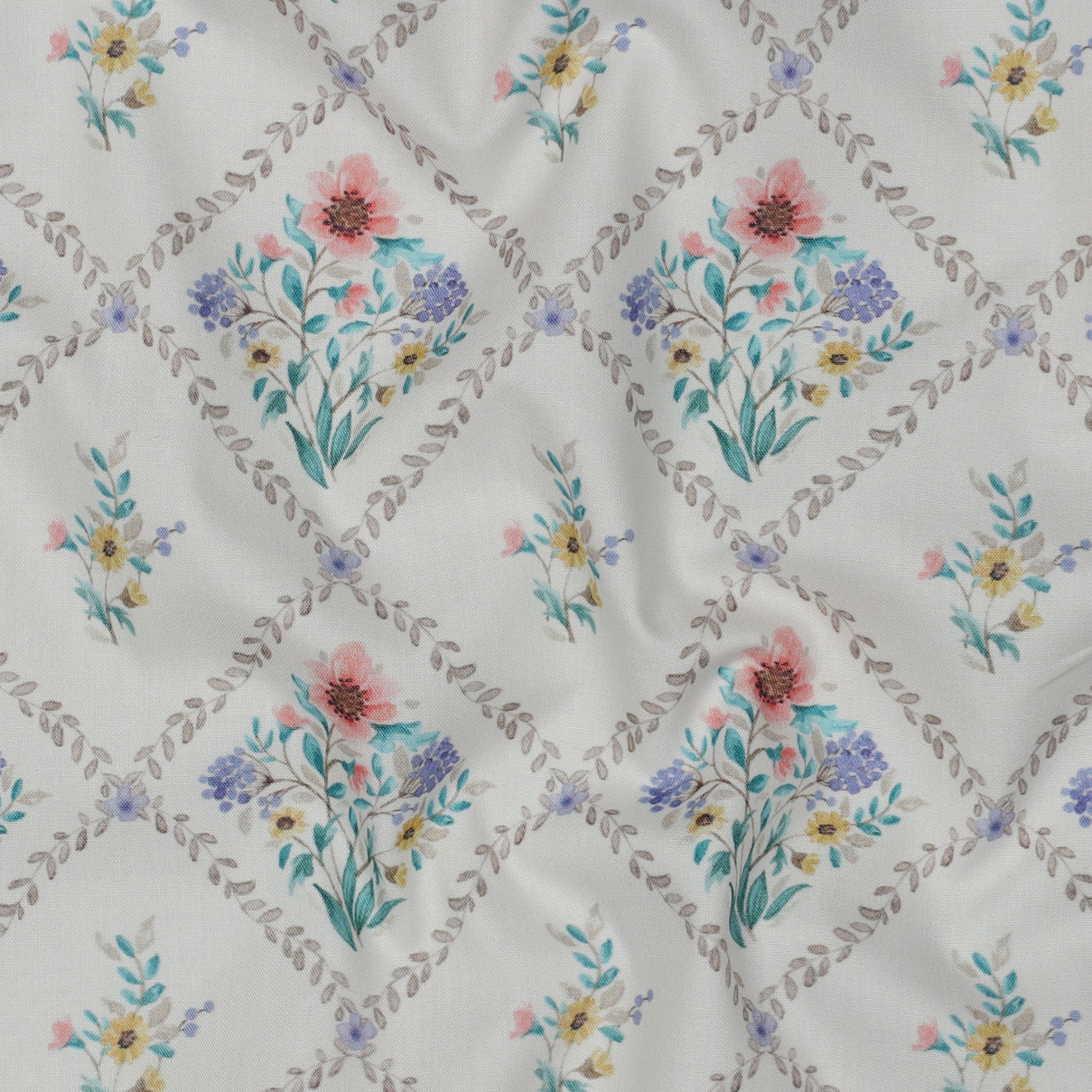Cette popeline de coton fleurs vintage séduit par son élégant motif floral disposé en losanges, dans de délicates teintes de rose, bleu, vert et jaune, sur un fond blanc cassé lumineux. Son style intemporel apporte une touche romantique et raffinée à toutes vos créations.