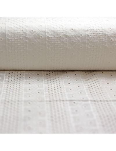 Très joli tissu broderie anglaise à motif bandes brodés sur le tissu blanc optique.