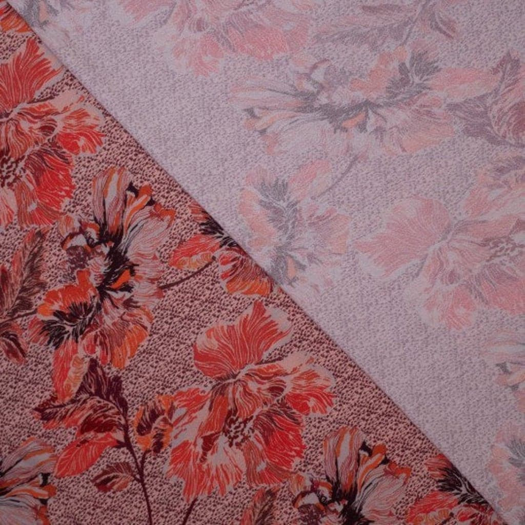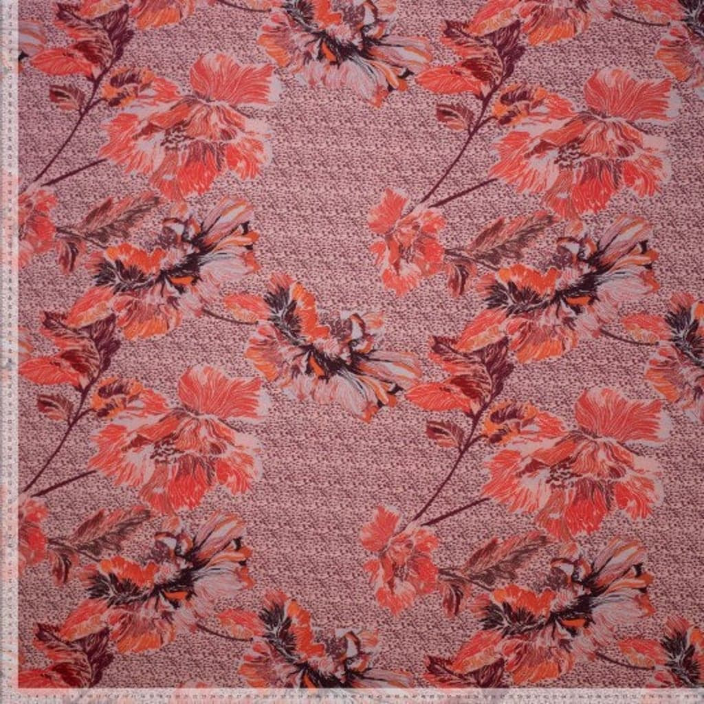 Joli crêpe de viscose assez lourd impression digitale à gros fleurs en rouge. Ce tissu est facile à coudre et agréable à porter.