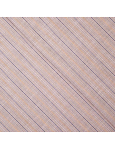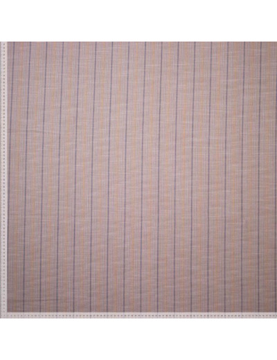 Tissu jacquard léger en coton à l'aspect lin à motif rayures fines violets, jaunes et blanches sur le fond beige.