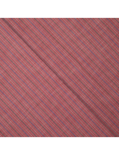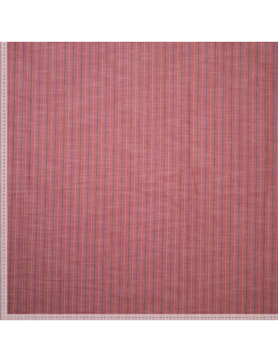 Tissu jacquard léger en coton à l'aspect lin à motif rayures fines bleues et grises sur le fond rouge.