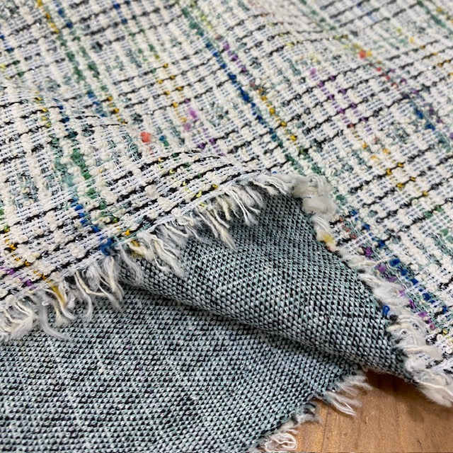 Tissu jersey maille Milano en coton mélangé à carreaux style tweed avec le fil lurex dans les tons de vert.