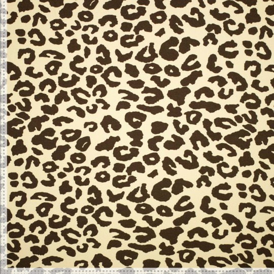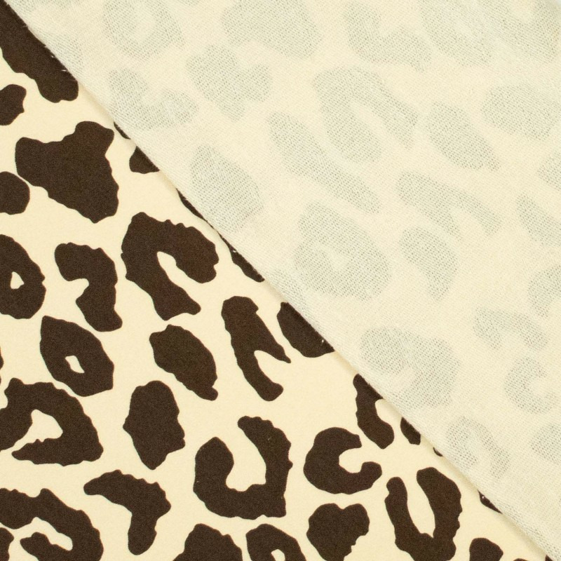 Tissu sweat extra chaud avec l'envers gratté tout doux. Imprimé grosses taches léopard couleur chocolat sur le fond beige clair.