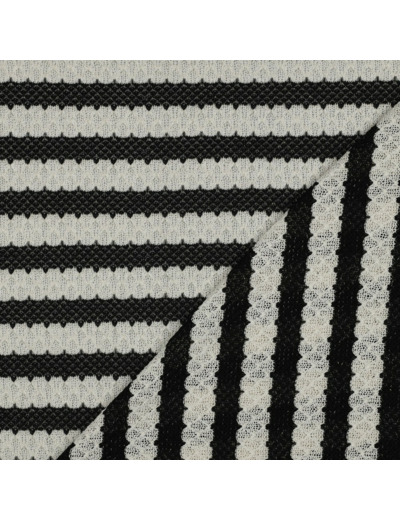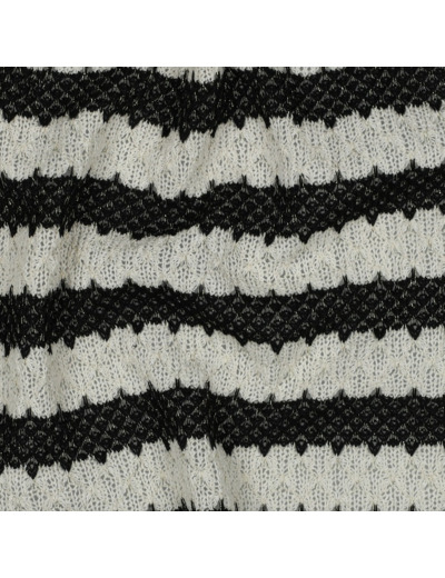 Apportez une touche d’élégance et de modernité à vos créations avec ce tissu maille jacquard à rayures noires et blanches rehaussé de fil lurex doré.