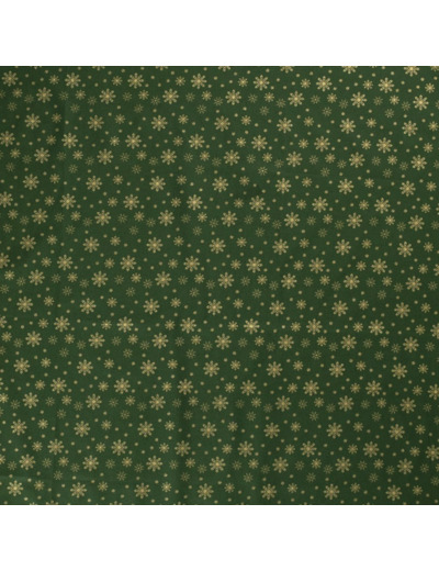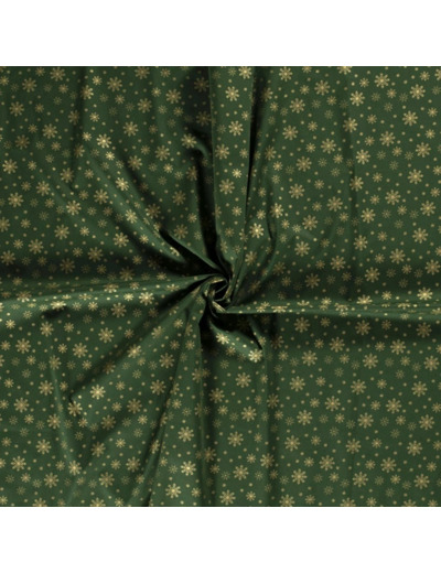 Popeline de coton de très bonne qualité avec un imprimé de flocons de neige dorés sur le fond vert foncé.