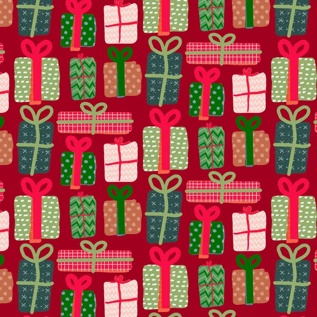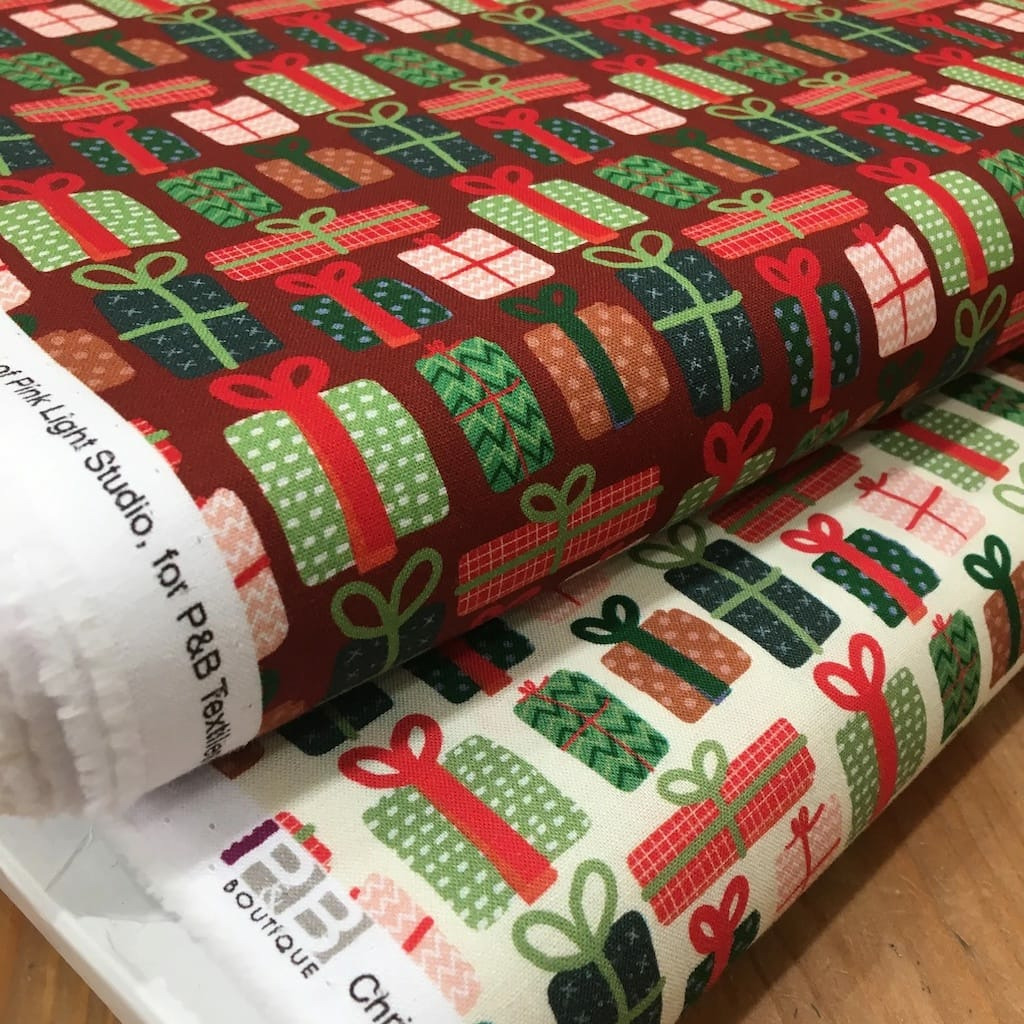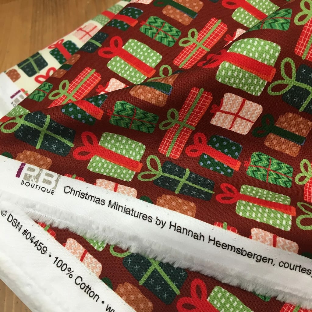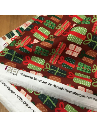 Popeline de coton de qualité patchwork (un peu plus épais que la popeline ordinaire, avec très bonne tenue) de la marque P&B Textiles, collection "Christmas Miniatures" imprimé paquets cadeaux sur le fond bordeaux.