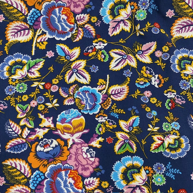 Popeline de viscose à motif fleuri sur le fond bleu indigo, légère , fluide et opaque pour vos robes, blouses, tops et jupes d'été.