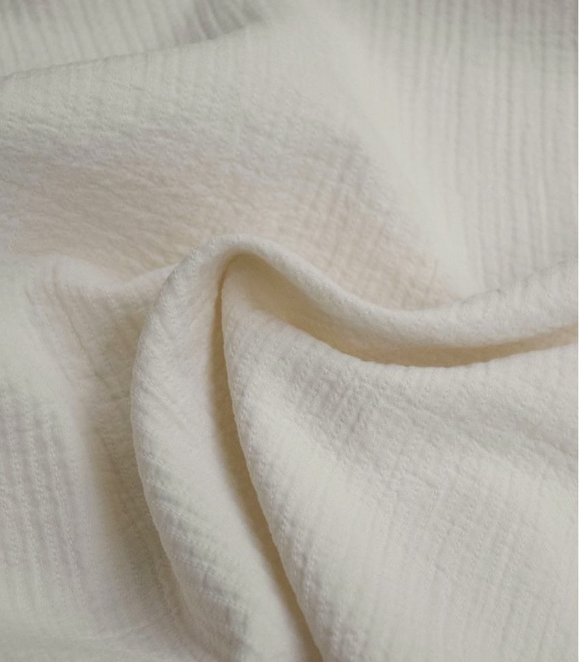 Tissu en coton écru composé de deux épaisseurs de coton fin. Les deux épaisseurs de tissus sont subtilement assemblées de coutures parallèles à la lisière formant une rayure verticale espacées de 5mm.