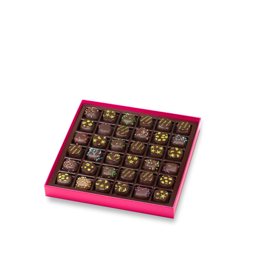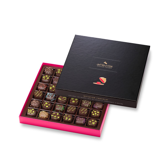 Pour le plaisir ou pour savourer, laissez-vous tenter par la collection Initiation Chocolat et ses chocolats noirs à l’amertume subtile et aux associations originales et raffinées. Les amateurs de chocolats noirs ne peuvent que se laisser emporter par cette invitation au voyage avec ce coffret de 36 chocolats. Un cadeau idéal pour faire vivre un pur moment d’émotion et de découverte. Partez au goût du monde avec des chocolats français.