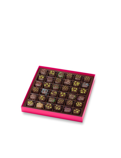Pour le plaisir ou pour savourer, laissez-vous tenter par la collection Initiation Chocolat et ses chocolats noirs à l’amertume subtile et aux associations originales et raffinées. Les amateurs de chocolats noirs ne peuvent que se laisser emporter par cette invitation au voyage avec ce coffret de 36 chocolats. Un cadeau idéal pour faire vivre un pur moment d’émotion et de découverte. Partez au goût du monde avec des chocolats français.