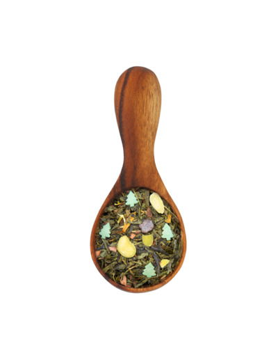 Thé vert ou noir aromatisé à l'orange, à l'amande et au chocolat, parsemé de petits sapins verts ou de petits flocons blancs.