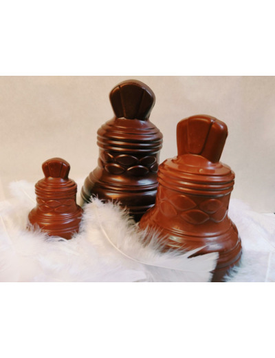 La Grande Cloche est un moulage garni de friture assortie, de 12x15cm et de 220gr environ. Au choix : chocolat blanc, lait ou noir. A retrouver aussi : la Petite Cloche (50gr - 5,5x7cm) et la Moyenne Cloche (150gr - 10x13cm)