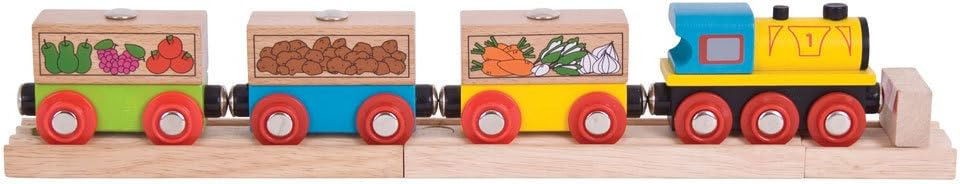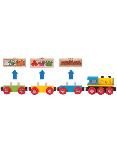 Cette locomotive en bois transporte fruits et légumes. Wagons magnétique. Livré avec 2 rails. Compatible avec d'autres grands systèmes de rails en bois. A partir de 3 ans.