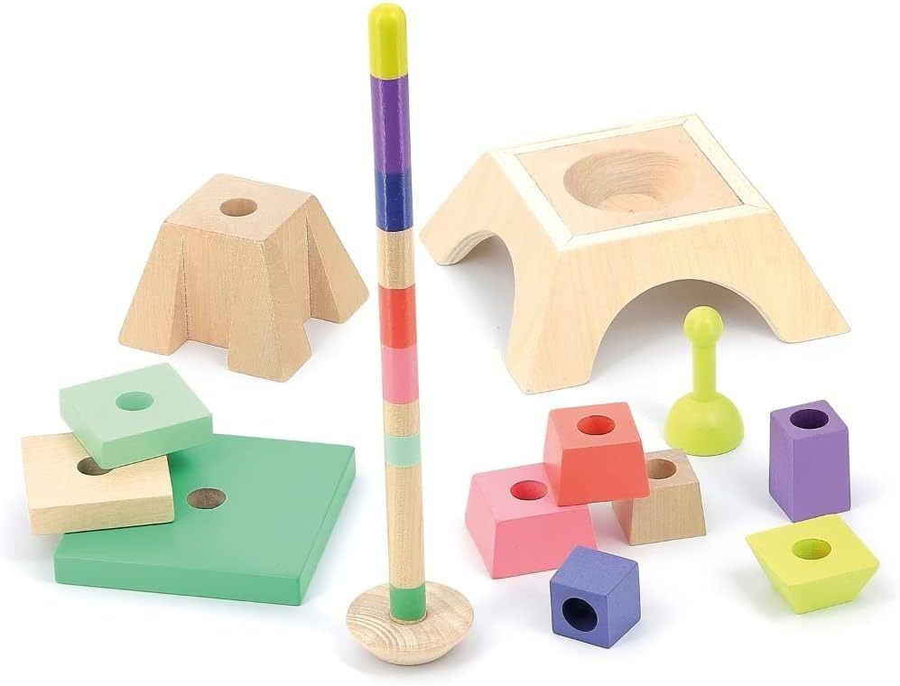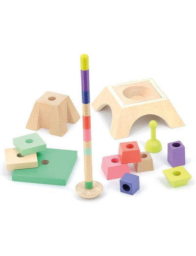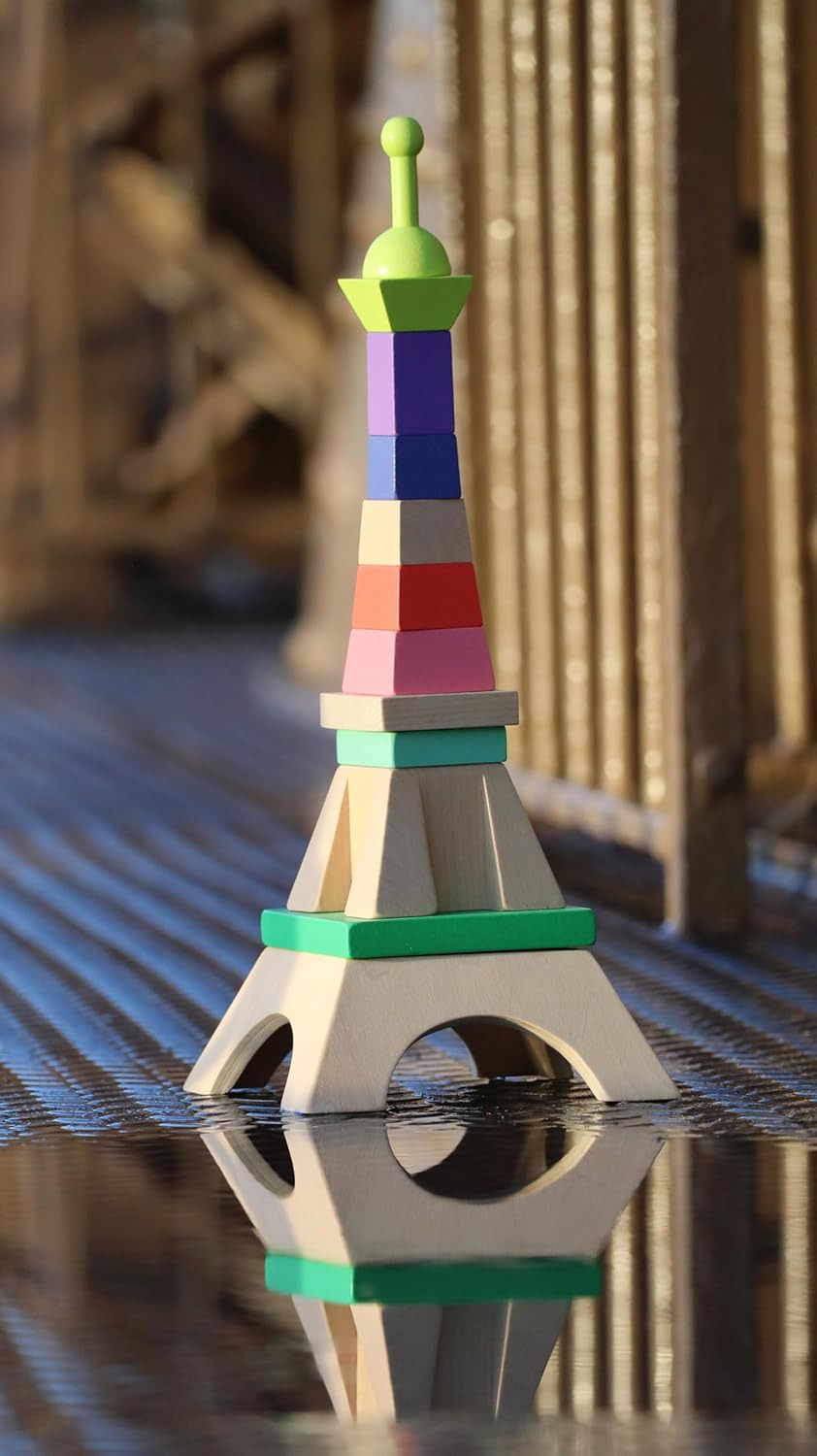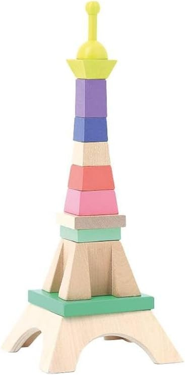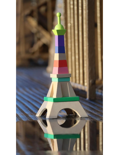 Vilac est très fier de ce partenariat avec la Tour Eiffel qui nous a confié ce projet conçu en collaboration avec une jeune designer pleine de talent. Un empilable en bois amusant pour reconstituer la Tour Eiffel parée de belles couleurs ou pour la déstructurer suivant l'imagination de chaque enfant. Un jouet d'éveil original pour exercer la motricité fine des petits et donner une touche très chic dans leur chambre. La tige centrale est décorée de lignes de couleurs pour aider les enfants à placer les différents éléments et est fixée par un élastique et s'affaisse pour éviter tout risque si un enfant tombait dessus.