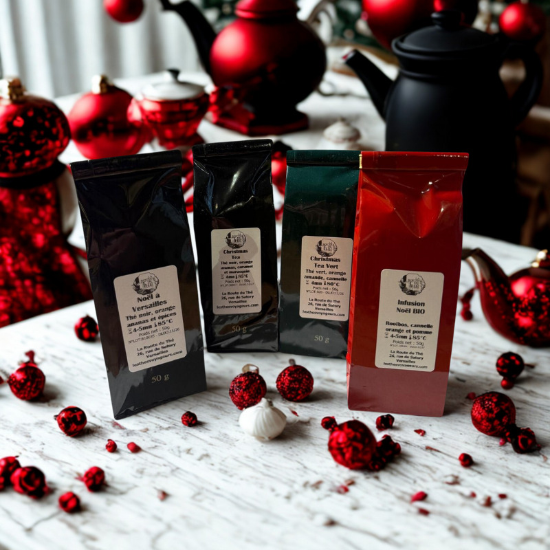 - Christmas Tea: Mélange parfumé traditionnel de Noël sur un thé noir avec de l'orange, du caramel, du marasquin et ananas confits, idéal les journées d'hiver.