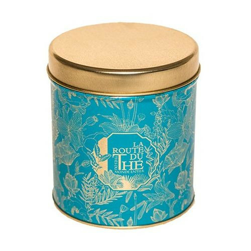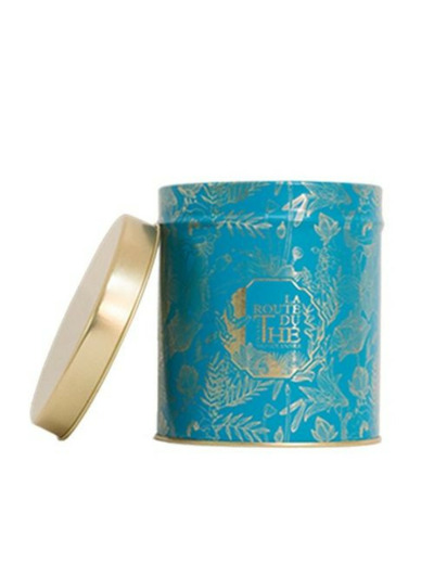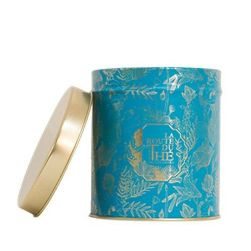 Boite vide en métal hermétique, bleue aux motifs la Route du Thé. Pratique pour une parfaite conservation des feuilles de thé.