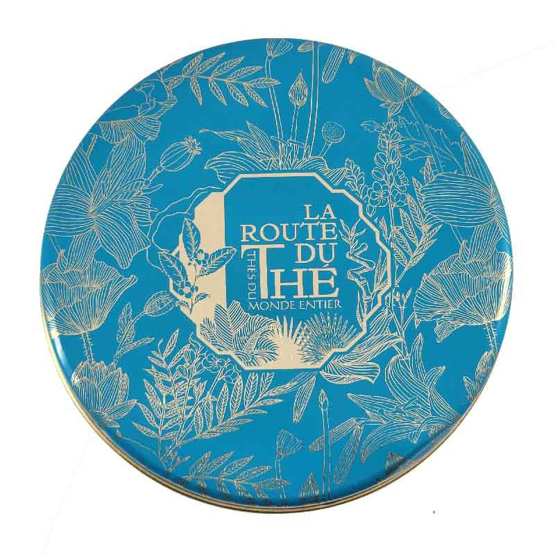 Boite vide en métal hermétique, bleue aux motifs la Route du Thé. Pratique pour une parfaite conservation des feuilles de thé.