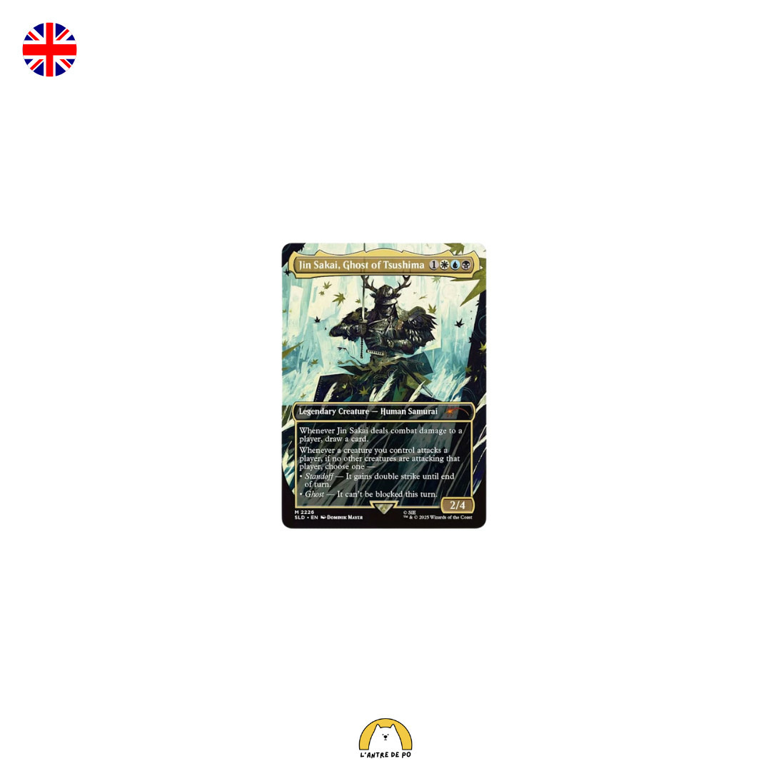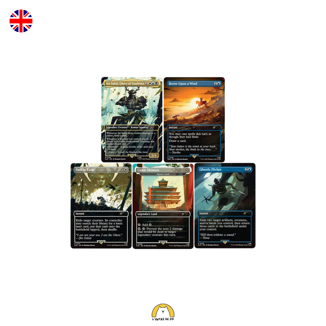 Contenu: 1x Jin Sakai, Ghost of Tsushima 1x Path to Exile 1x Borne Upon a Wind 1x Ghostly Flicker 1x Eiganjo Castle as "Castle Shimura"