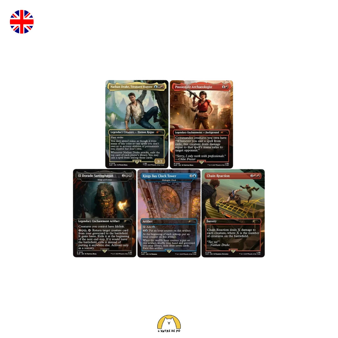 Contenu: 1x Nathan Drake, Treasure Hunter 1x Midnight Clock as "Kings Bay Clock Tower" 1x Whip of Erebos as "El Dorado Sarcophagus" 1x Chain Reaction 1x Passionate Archaeologist