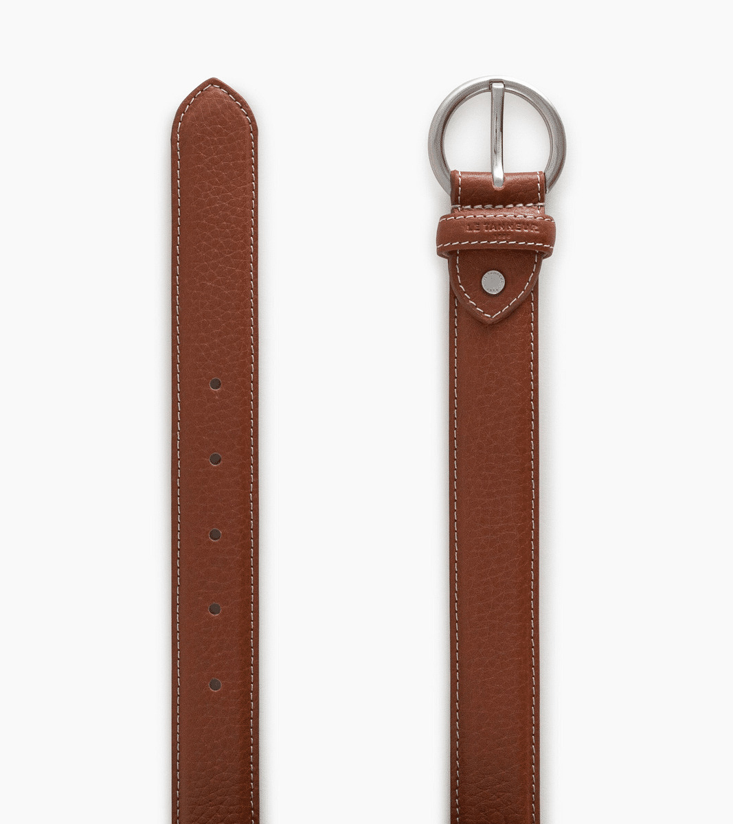 Ceinture femme avec boucle ronde finition argent. Passant marqué Le Tanneur ton sur ton et coutures contrastées.