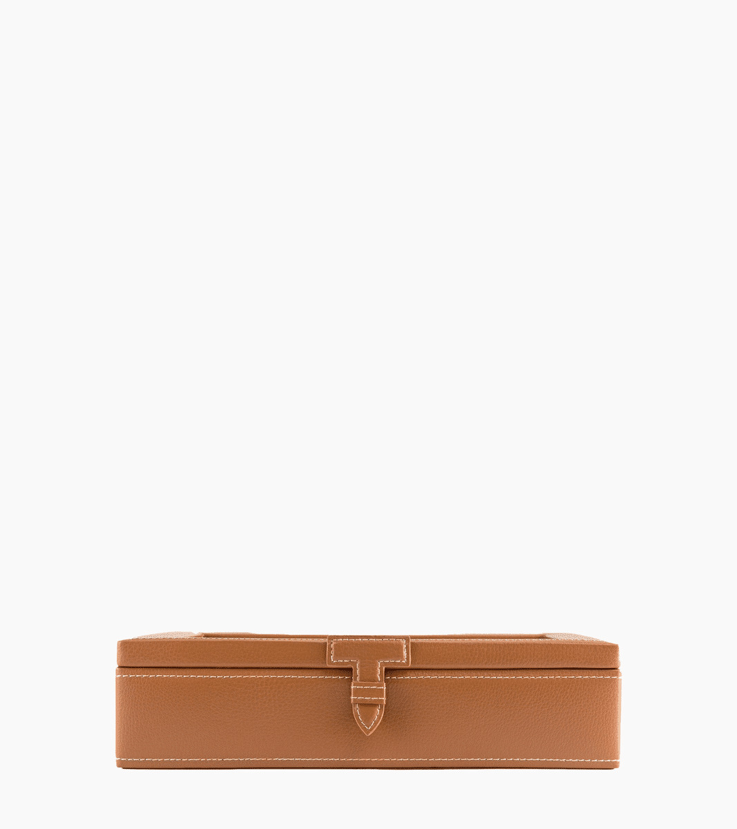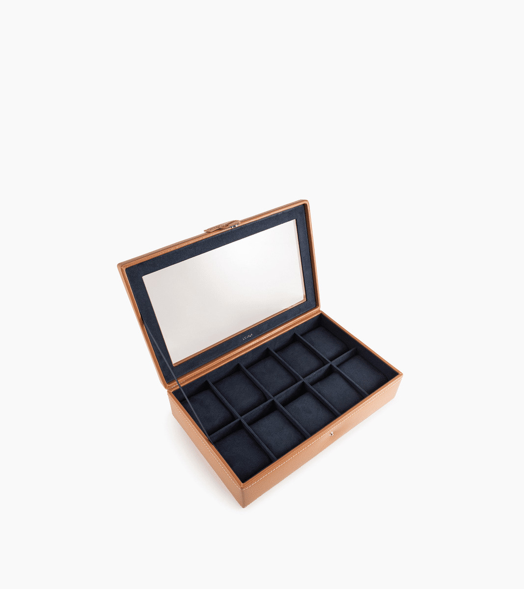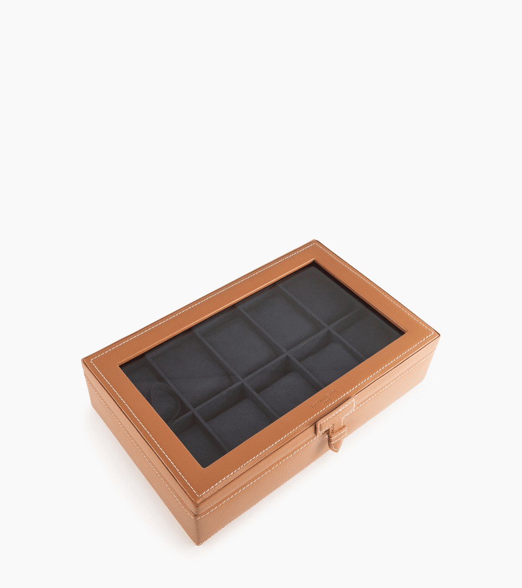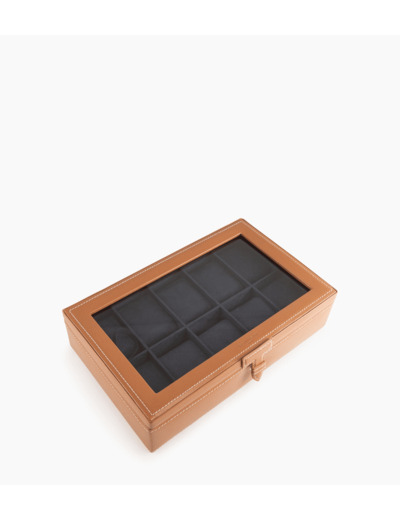 Coffret huit montres vitré avec doublure velours, marquage Le Tanneur ton sur ton et fermoir en T signature.