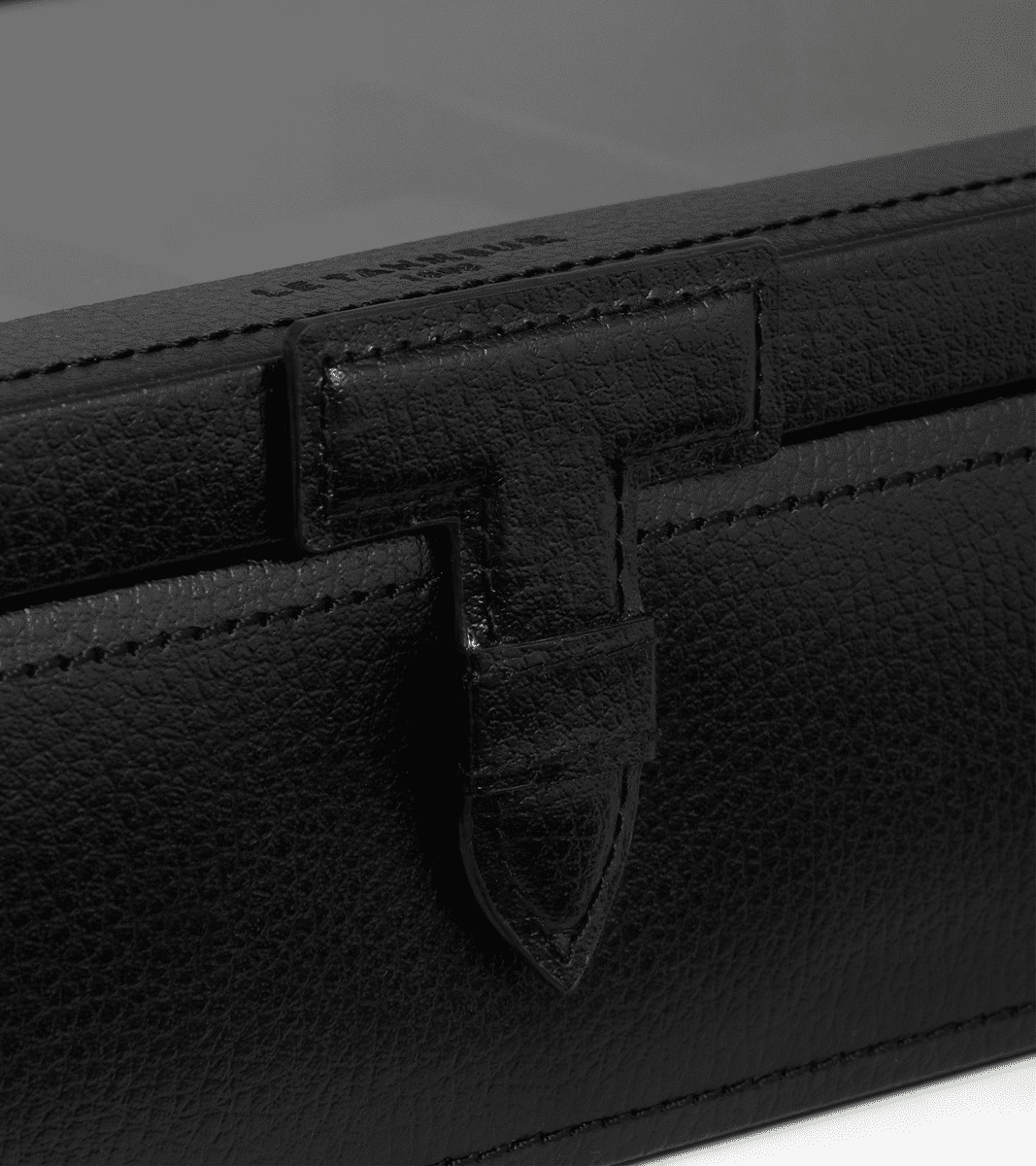 Coffret douze montres vitré avec doublure velours, marquage Le Tanneur ton sur ton et fermoir en T signature.
