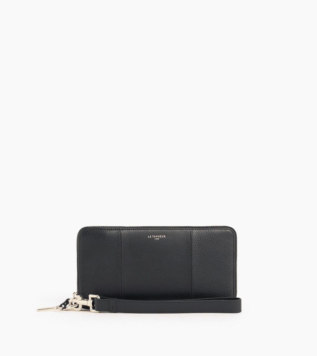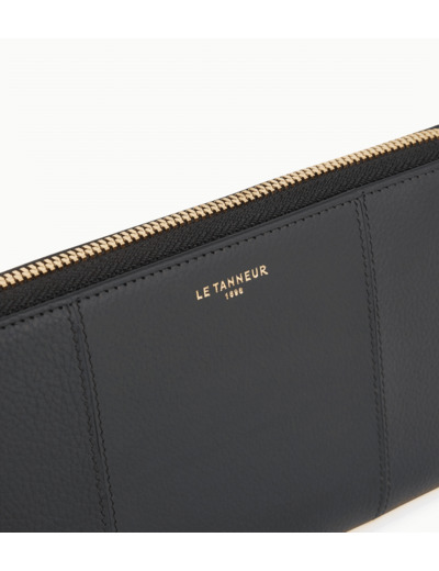 Compagnon zippé en cuir signature avec dragonne amovible. Zip, marquage Le Tanneur et charms T signature finition doré clair. Sécurité anti-RFID.