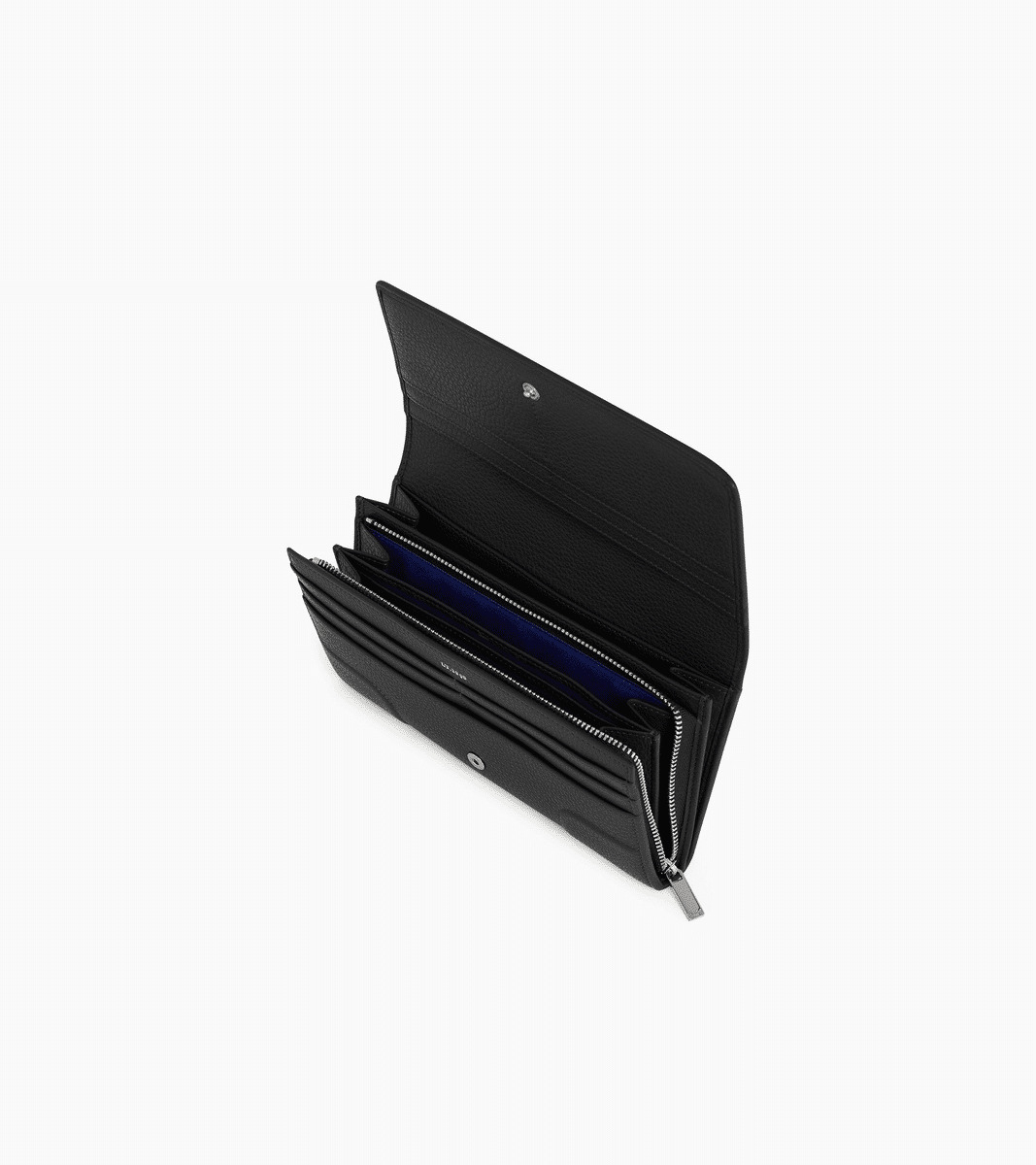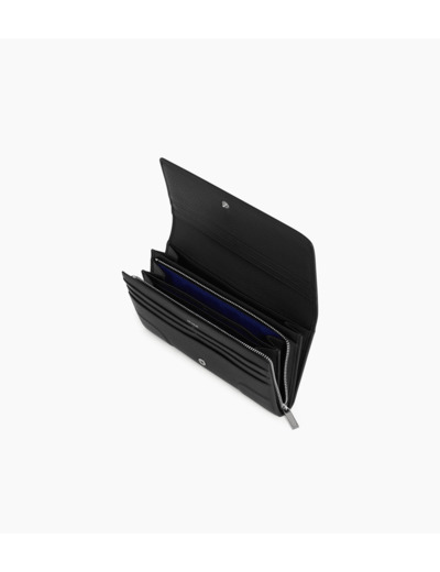 3 poches plates, 1 soufflet, 1 poche zippée monnaie et 12 compartiments cartes.