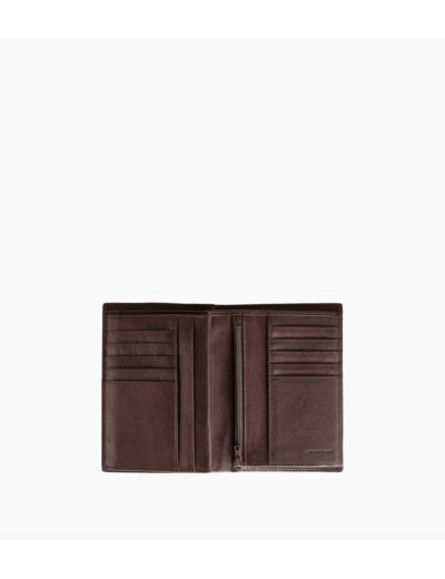 4 poches plates, 3 poches ID, 1 poche monnaie zippée, 2 poches billets et 10 compartiments cartes.